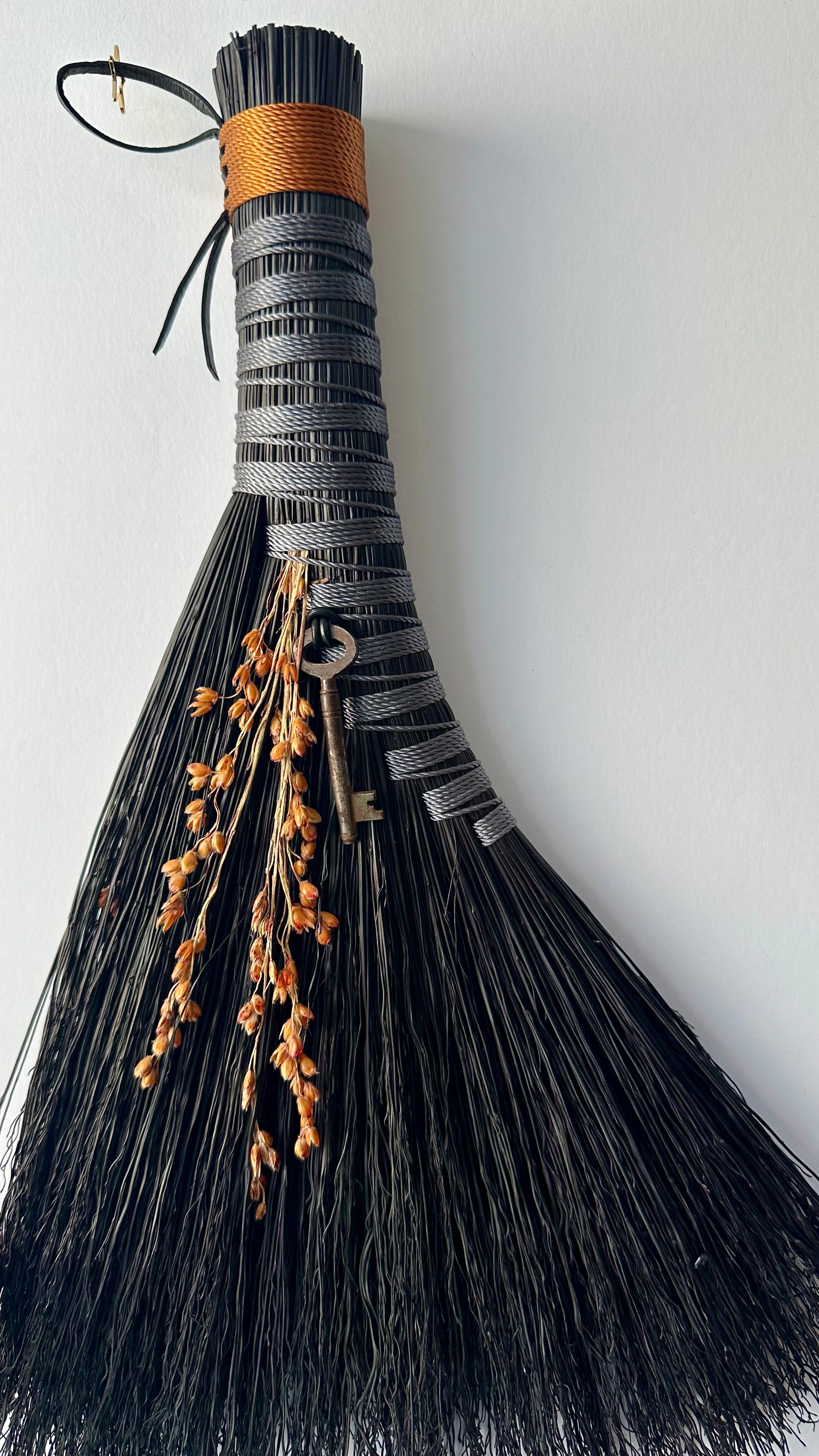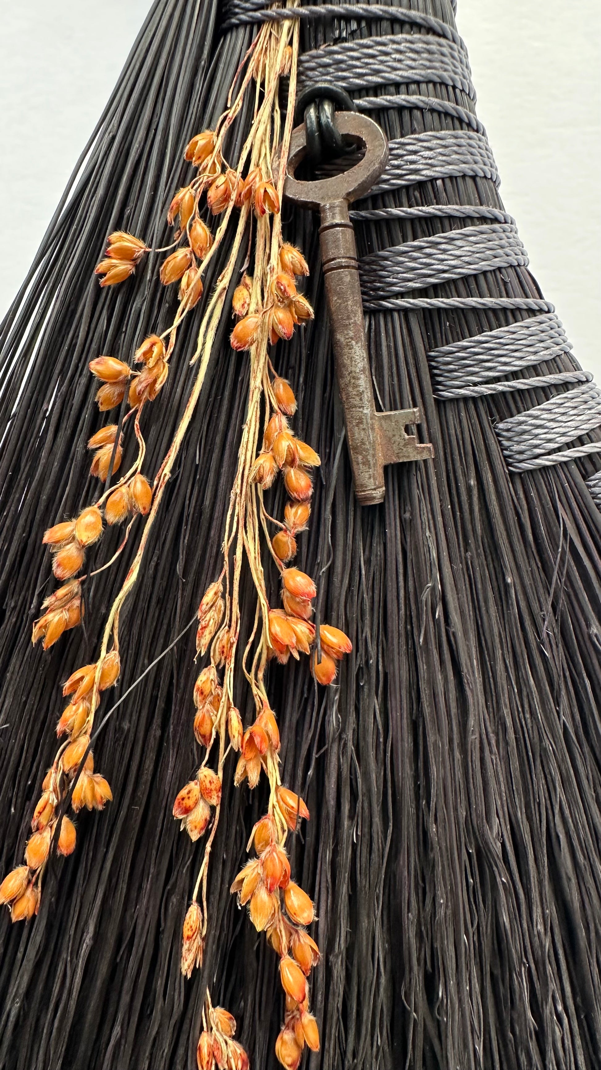 Materials: Black hand dyed broomcorn (sorghum), double twist polytwine in charcoal, leather hanging loop, broomcorn seed spray, vintage key and gold plated star charm.