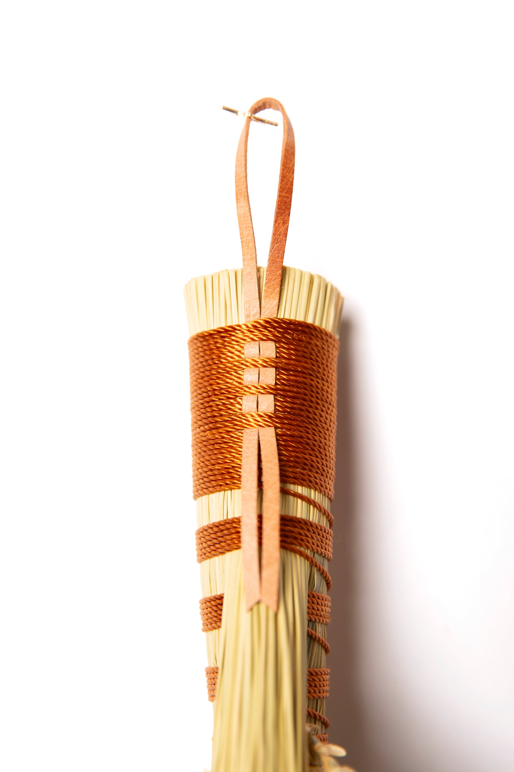 Materials: Natural broomcorn (sorghum), double twist poly twine in gold, dried florist grade natural wheat, leather hanging loop, and gold plated star charm.