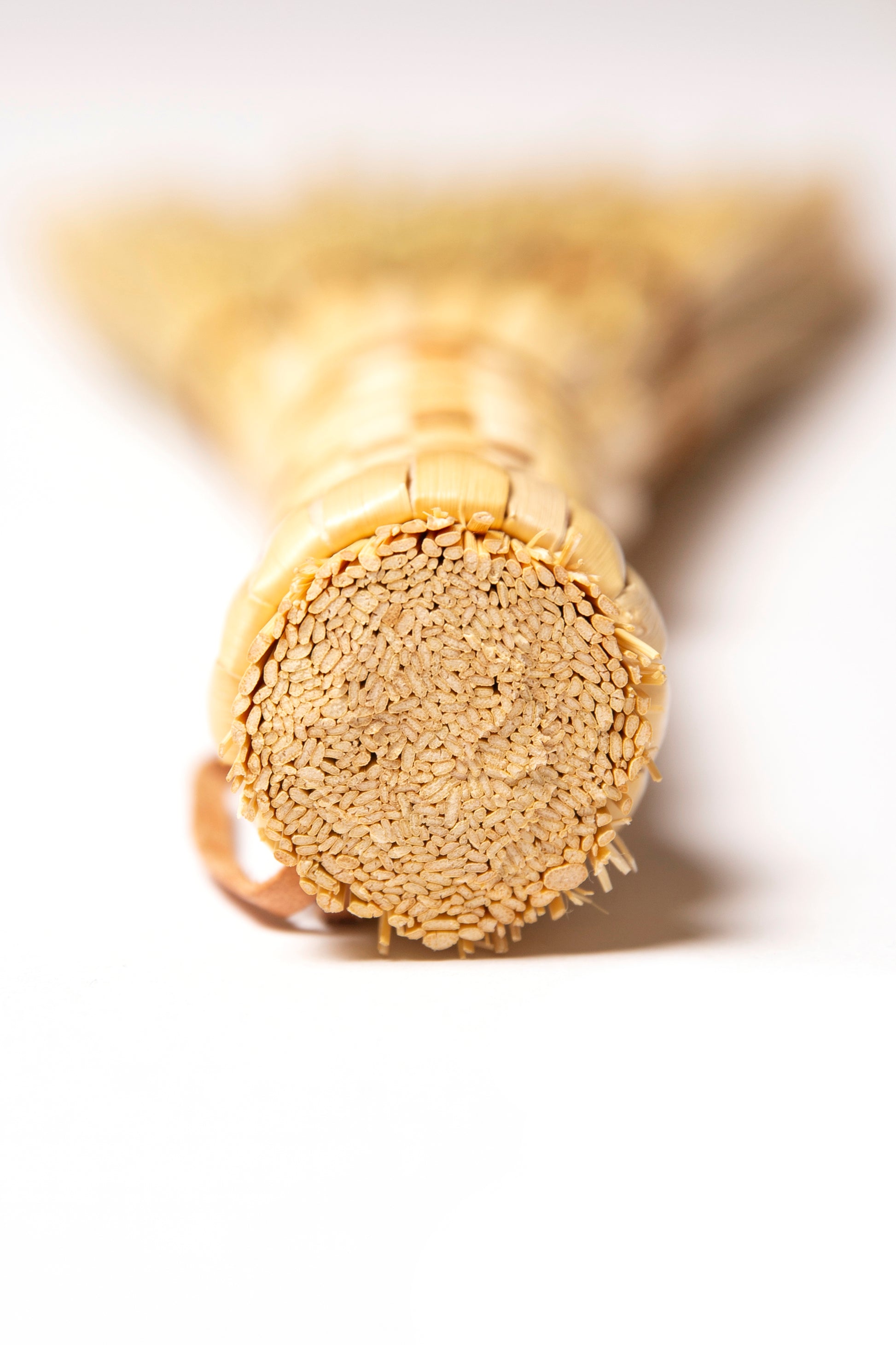 Handcrafted using pre-industrial heritage methods still practised by broom makers around the world. This hand broom features a round broom construction, stitched flat and finished beautifully with a woven grip which is surprisingly durable, efficient and beautiful. The grip is woven with stalks of broomcorn soaked in water and dried using traditional techniques passed down through generations of craftspeople.