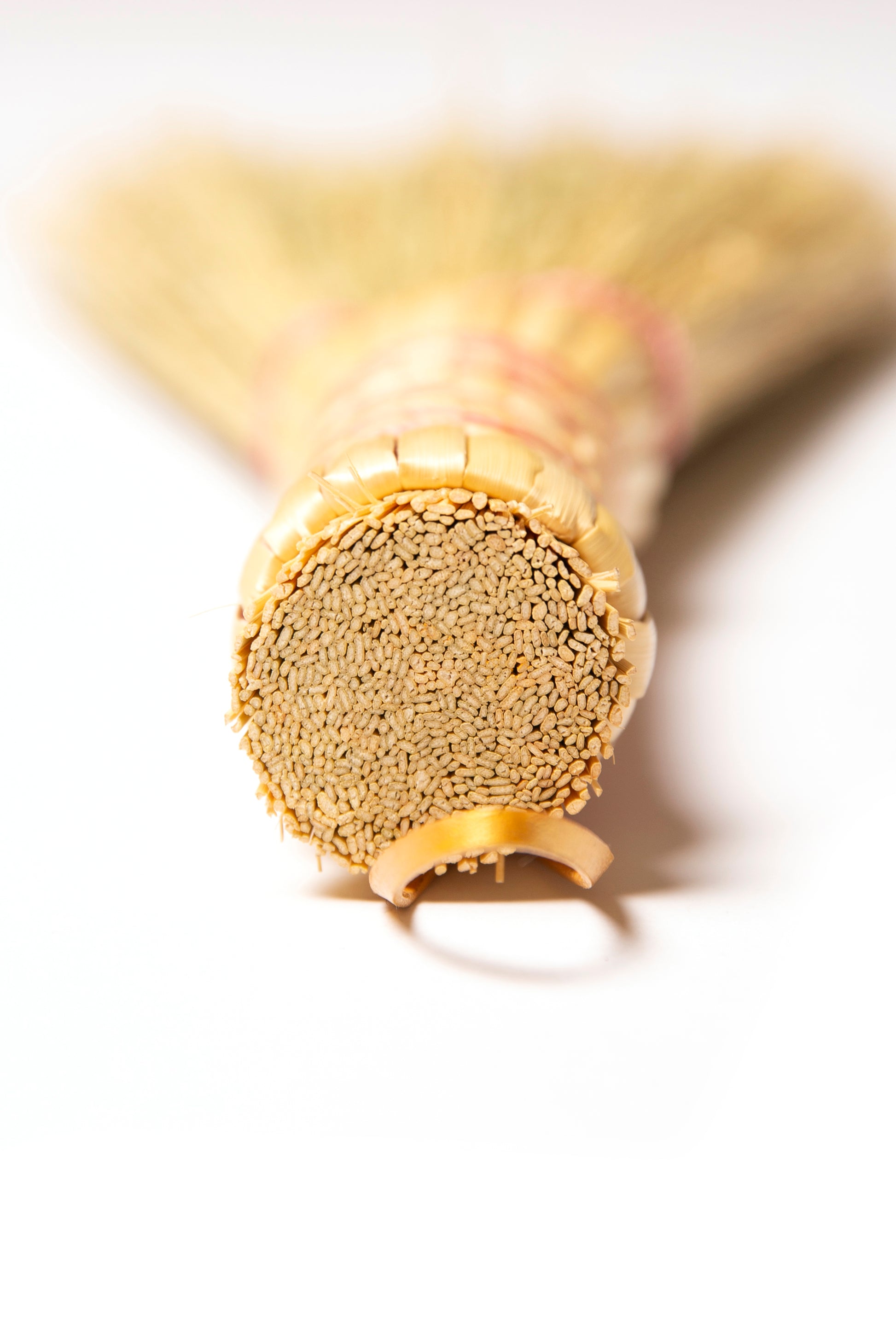 Handcrafted using pre-industrial heritage methods still practised by broom makers around the world. This hand broom features a round broom construction, finished with a woven grip in a twill pattern which is surprisingly durable, efficient and beautiful. The grip is woven with stalks of broomcorn soaked in water and dried using traditional techniques passed down through generations of craftspeople.